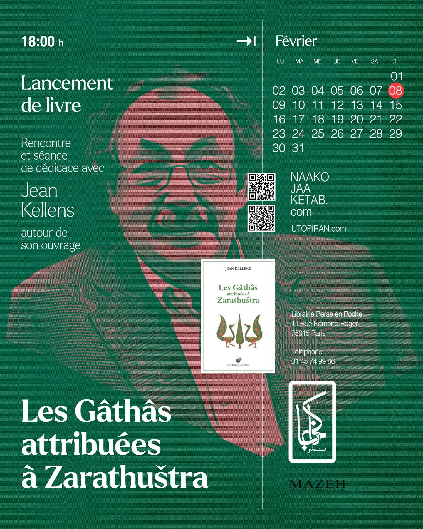 Le dimanche 8 février, Céline Redard animera une discussion autour de l'ouvrage Les Gāthās attribuées à Zarathuštra. Aux origines de l’Avesta et de la religion zoroastrienne de Jean Kellens (professeur honoraire au Collège de France) en présence de l'auteur à la Librairie Perse en Poche (11 rue Edmond Roger, Paris, 15e). Cette nouvelle traduction réalisée par l'un des plus grands spécialistes mondiaux, accompagnée de commentaires, a pour objectif de donner à lire ce corpus de poèmes - Gāthās ou « chants » - qui furent composés dans une langue particulièrement archaïque et conservés dans l’Avesta, le recueil des plus vieux récitatifs sacrificiels de la religion zoroastrienne.